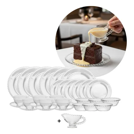 Aparelho Jantar Premium De Cristal 24 Peças Borda Bolinhas Perola Pearl Wolff Com Pires Redondo + Grátis Molheira