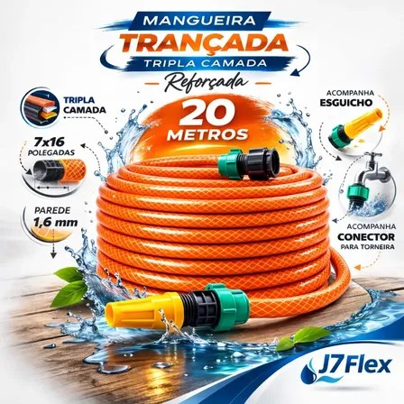 Mangueira De Jardim 20 Metros Trançada Reforçada Flexível Laranja 7/16 Com Esguicho Para Irrigação Quintal Lavagem Durável J7 Flex