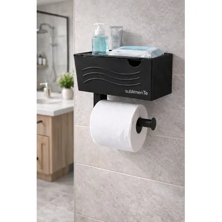 Suporte Porta Papel Higiênico Lenço Umedecido Base Para Celular Caixa Objetos Lavabo Banheiro Fácil Instalação Cor Preto Sublimente