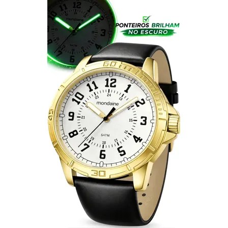 Relógio Mondaine Masculino Analógico Casual Prova Dágua 50m Correia Preto Bisel Dourado Fundo Branco