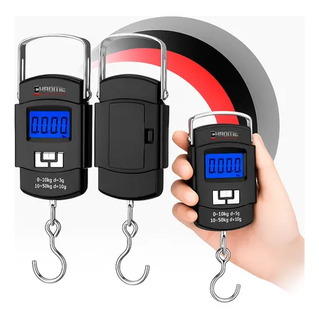 Balança Para Pesca Peixe Com Gancho De Mão Pendurada Digital Portátil Bolsa Bagagem Mala Até 50kg Chrome Technology Balança Preta Digital