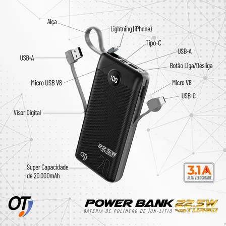 Power Bank O.t 20.000mah De Carga Rápida Com Display Digital Preto