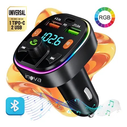 Inova Cases Carregador Veicular Automotivo Bluetooth Transmissor Fm Receptor Adaptador Qc3.0 Com 1 Pd Tipo C/usb C + 2… Preto