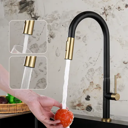 Torneira Bancada Monocomando Cozinha Inox 304 Flexível Bica Extensível 360° Prateado Cor Preto + Dourado Acabamento Fosco Winda