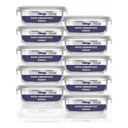Kit 10 Marmitas De Vidro 640ml Potes Com Tampa Hermética 4 Travas Transparante