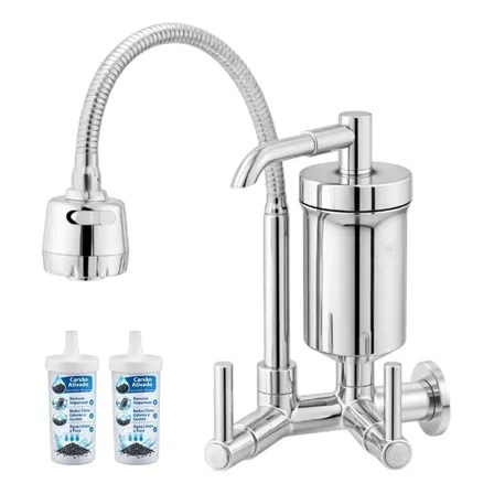 Torneira De Cozinha Com Filtro Gourmet 2 Jatos Tubo Flexível Refil Carvão Ativado Água Filtrada Purificada Marca Forte Lar Metais Parede Prateado Cromado Parede Cromado